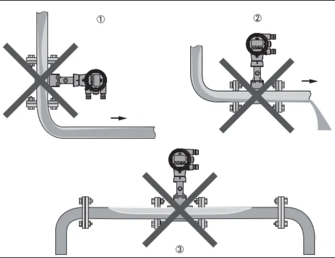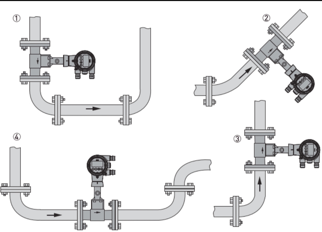গ্যাস/বাষ্প প্রয়োগের জন্য, পাইপলাইন সর্বদা গ্যাসে পূর্ণ থাকে। অতএব, ফ্লোমিটারটি উল্লম্ব ঊর্ধ্বমুখী প্রবাহ, উল্লম্ব নিম্নমুখী প্রবাহ বা অনুভূমিক অভিযোজনে ইনস্টল করা যেতে পারে। যাইহোক, এটি কম পয়েন্টে ইনস্টল করা উচিত নয়। প্রস্তাবিত ইনস্টলেশন অবস্থানগুলি হল: