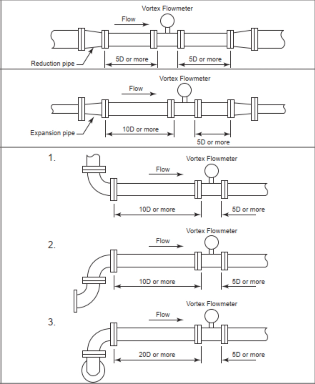 3. স্ট্রেইট পাইপ বিভাগ আপস্ট্রিম এবং ডাউনস্ট্রিম (যদি তাপমাত্রা এবং চাপের যন্ত্রের প্রয়োজন হয়, তবে সেগুলি ফ্লোমিটারের ডাউনস্ট্রিমে ইনস্টল করা উচিত। ডাউনস্ট্রিম যন্ত্রগুলিও সোজা পাইপ বিভাগের বাইরে অবস্থিত হওয়া উচিত। একাধিক যন্ত্রের জন্য প্রস্তাবিত বিন্যাস অর্ডার হল: ফ্লোমিটার, চাপ ট্রান্সমিটার, তাপমাত্রা ট্রান্সমিটার)। সাধারণত, প্রস্তুতকারকের পণ্যের নমুনায় উল্লেখিত সোজা পাইপ দৈর্ঘ্যের প্রয়োজনীয়তাগুলি পড়ুন (অথবা উপকরণ ম্যানুয়াল অনুসারে 15D আপস্ট্রিম এবং 5D ডাউনস্ট্রিমের সাধারণ নির্দেশিকা)। ঘূর্ণি ফ্লোমিটারের জন্য আপস্ট্রিম এবং ডাউনস্ট্রিম সোজা পাইপের প্রয়োজনীয়তা সম্পর্কে পাইপিং ইঞ্জিনিয়ারিং দলকে আগে থেকেই অবহিত করুন। একবার ইন্সট্রুমেন্ট প্রস্তুতকারক নির্বাচন করা হলে, প্রস্তুতকারকের স্পেসিফিকেশন অনুযায়ী ইনস্টলেশনের প্রয়োজনীয়তাগুলি পুনরায় নিশ্চিত করতে হবে।