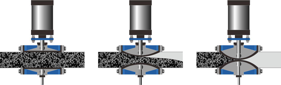 বন্ধ: ড্রাইভ মেকানিজম (ম্যানুয়াল, নিউম্যাটিক বা বৈদ্যুতিক) দুটি ক্ল্যাম্পিং রডকে ঠেলে দেয়, একটি বায়ুরোধী সীল অর্জন করতে কেন্দ্ররেখা বরাবর স্থিতিস্থাপক হাতাকে সুনির্দিষ্টভাবে সংকুচিত করে। এমনকি যখন কঠিন কণাগুলি মিডিয়ামে উপস্থিত থাকে, তারা শক্তভাবে আবদ্ধ এবং অবরুদ্ধ থাকে।